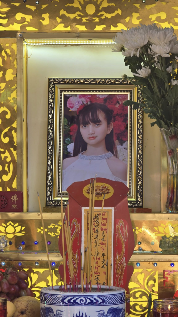 Khoảng 7h, người đàn ông chạy xe trên tuyến đường bêtông dọc kênh Lô 1, thuộc ấp 8, phát hiện thi thể nạn nhân nổi lên mặt nước, cổ có vết thương. Thiếu nữ mặc áo thun màu xám trắng, bên ngoài có áo khoác xám tro.